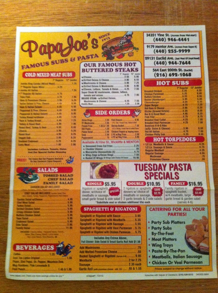 Papa Joe's Subs & Pasta Menu (Update 2025)